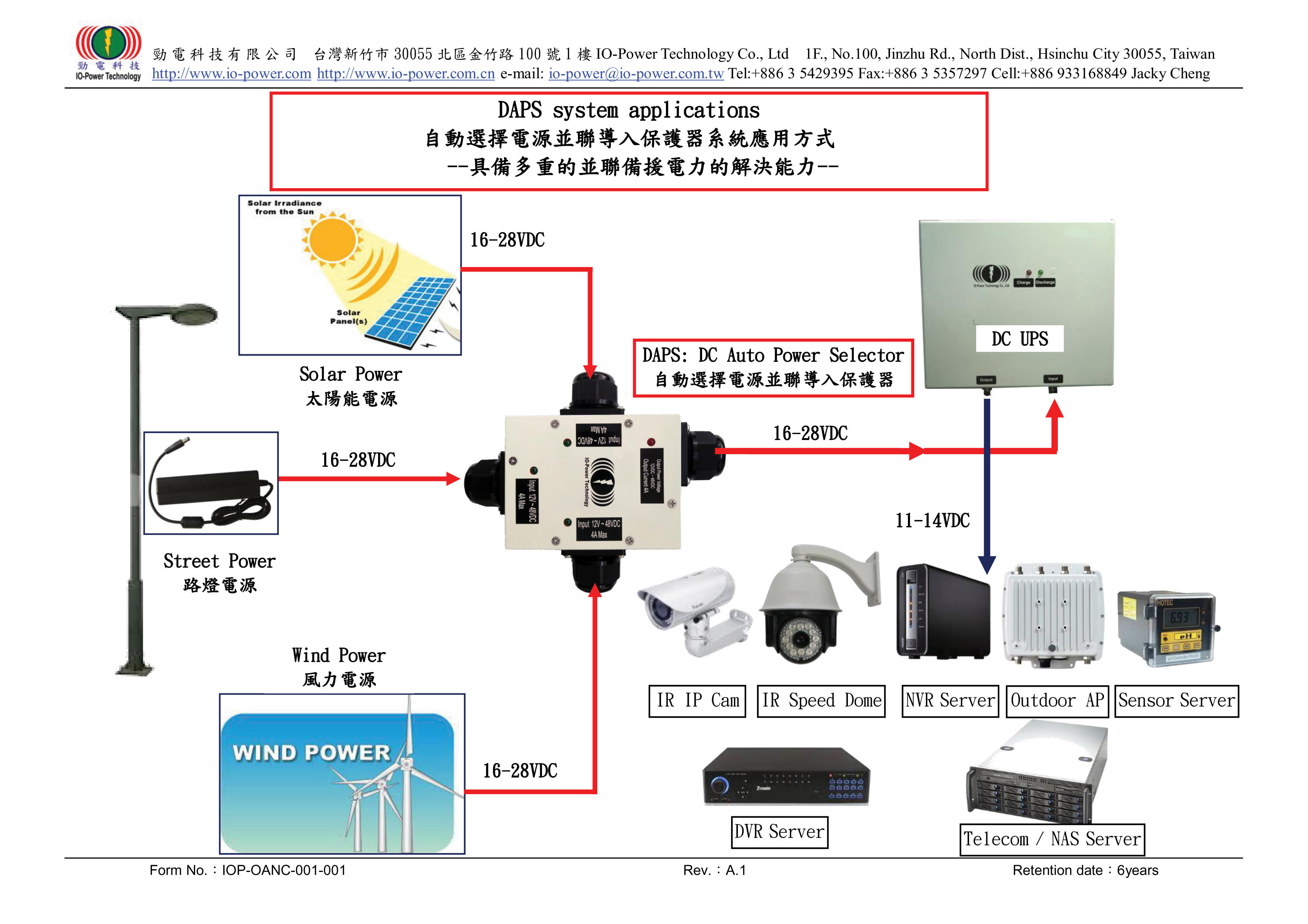 勁電科技 IOP-DAPS-I3O18A-2 室外自動選擇電源並聯導入保護器:12~48VDC Outdoor Automatic Selection Power Supply Parallel Introduction Protector: 12~48VDC 透過多種電力來源的『並聯整合保護技術』,對室外直流不斷電系統進行充電 << 高效率太陽能併聯發電系統--指定專業搭配使用>>