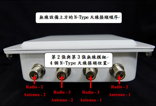 APM-100R(H) 系列產品包括: 1. APM-101R(H) : 1個雙頻 2x2 MIMO無線模組介面, 具有2個N-Type天線接頭 2. APM-102R(H) : 2個雙頻 2x2 MIMO無線模組介面, 具有4個N-Type天線接頭 3. APM-103R(H) : 3個雙頻 2x2 MIMO無線模組介面, 具有6個N-Type天線接頭 我們強烈建議,安裝無線設備前,請先詳細確認設備的上下方天線接頭的N-Type位置與排列順序。
