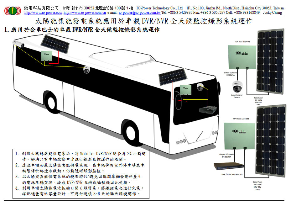 勁電USSS-12V1224-OA系列是特別針對系統工程商於室外工程施工時,因無法取得穩定有效電力來源,造成工程專案執行面臨無法完工驗收問題,提出獨創的整合太陽能直流電源與耐高低溫鐵鋰電池及特別針對大電流大功耗室外負載系統設備,所設計的新一代室外太陽能在線集能式發電系統解決方案,徹底解決系統工程商在室外工程施工無法取得穩定有效電力問題,大電流放電特性可應付如DVR(Digital Video Recorder)類比轉數位影像錄影主機、NVR(Network Video Recorder)數位網路影像錄影主機、紅外線攝影機、紅外線投射器、熱能轉換設備…等較大放電電流設備的太陽能在線集能式發電系統。 勁電科技導入最新技術的耐高低溫鐵鋰電池,採取太陽能在線式陰雨天集能發電供應系統設計,特別適合陰雨天環境下,仍能擷取有限的直流電力,以為電池及設備提供基本運作電力的來源,達到最節能的太陽能在線集能式不斷電供電系統。透過陰天集能發電設計,縮減太陽能電池光板的使用面積與減少蓄電池的使用容量,導入鐵鋰電池的耐高低溫等特性,實現太陽能系統—架設成本更低、架設空間更小、使用壽命更長、維護成本更低、取電模式完全自主,讓系統工程商真正願意採用太陽能系統成為新一代室外取電的解決方案。 太陽能在線集能式陰雨天發電系統所搭配的長效鐵鋰電池,可依相關系統設備的總耗電量需求,整合適當對應的電池總容量與太陽能電池光板瓦數,以提供最少36~72小時的設備運作電力,足夠應付連續3天陰天的使用環境,進一步若設備需提高運作天數,可透過增設電池總容量與加大太陽能電池光板瓦數,達到延長電力供應時間達6~7天。 勁電USSS-12V1224-OA系列產品,採用工業級的鋁金屬散熱防護外殼與防水防塵達到IP67的機構設計及工業級耐高低溫M12接頭,以應付室外-20°C ~ +45°C嚴酷的環境溫度考驗,讓室外太陽能不斷電電力系統仍能日夜安全且穩定的正常運作,同時並導入最新技術的耐高低溫鐵鋰電池與獨特充放電電池管理控制及靜態零功耗…等專利技術,實現室外可壁掛及立桿架設的安全長效的太陽能在線集能式陰雨天發電系統的新應用。 太陽能在線集能式陰雨天發電系統,導入太陽能搭配鐵鋰電池的電源應用特性,可直接應用於DVR錄影主機、NVR錄影主機、室外有線監控系統、室外遠距無線監控系統、室外紅外線錄影監控安全系統、室外紅外線投射燈、室外資料擷取設備系統、室外備用電力系統、高速公路收費營運錄影監控及車牌辨識紀錄系統、室外大型電子看板傳輸系統、電梯安全錄影監控系統、移動電源供應系統、24小時行車紀錄器攝影機系統、礦坑及特殊工作環境設備系統、金融機構安全防護系統、消防安全系統…等。 勁電USSS-12V1224-OA系列,太陽能在線集能式陰雨天發電系統的運作組成元件包括: 1.輸入直流電源端:太陽能直流電源12V~28V電壓輸入,以為太陽能在線集能式陰雨天發電系統的運作電力來源。 2.微處理器模組:微處理器針對輸入太陽能直流電源進行偵測管理、電池充電管理、電池放電管理、輸出電源控制管理、系統運作偵測與保護控制管理,執行整體系統的維運統籌及控制管理。 3.充電與放電控制電路:針對電池進行電壓偵測與充電平衡管理及電池放電管理控制,其中獨特的CCP/CVP充電專利技術,輔以靜態零功耗的放電專利保護機制,對電池的低壓保護及系統快速恢復運作,提供最佳保護與高效率的運作機制。 4.輸出直流電源端:透過微處理器進行直流電源放電偵測控制與保護,針對負載設備的電力要求,採取相對應適當電流的電力供應,由最小0.5A至最大6A的直流電流供應控制。 5.特別強化的保護措施:針對室外環境的高低溫變化,對電池的壽命與使用效率,可能產生嚴重影響,甚至產生使用上的安全問題,因此針對USSS-12V1224-OA室外型產品系列,特別設計工業級密閉鋁金屬散熱防護外殼與防水防塵達到IP67的機構設計及工業級耐高低溫M12接頭,以避免室外環境使用上的安全問題發生。 6.耐高低溫長效鐵鋰電池:因應室外運作中系統的不可中斷並需以大電流大功耗方式放電及更長效使用需求,傳統一般的室外太陽能不斷電電力系統,很明顯地無法提供應有的服務;USSS-12V1224-OA系列採取大電流充電與大電流的放電系統設計,透過新的鐵鋰電池高充放電次數與大電流大功耗放電特性及超長電池壽命,以提供比傳統一般太陽能不斷電系統更多的供電電力容量與系統運作時間及7倍以上的使用壽命,充分呈現太陽能在線集能式陰雨天發電系統的優異特性。 7.各式高效能太陽能電池(或其他直流輸入電力):USSS-12V1224-OA室外型產品系列,可搭配各種太陽能電池光板(或其他綠色能源,如風力發電、水力發電…等),總瓦數從80W~130W,12V~28V電壓範圍,電流4A~7.5A,鐵鋰電池11.6Ah~23.2Ah的蓄電容量,輔以陰雨天集能發電設計,可輕易達到系統連續陰天2~3天的不中斷運作要求,讓系統工程商真正享受到太陽能系統所帶來的施工與更容易取得自來電力的效益。 IOP-USSS-12V1224-OA系列技術規格 (*專利保護)